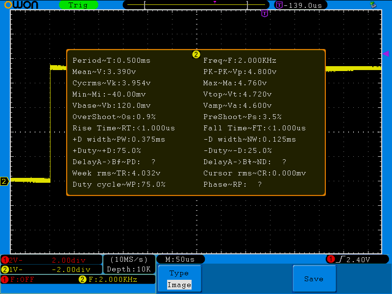 Dutyは75%になっているのでプログラムで指定した通りのデューティー比だ(cycle:500, duty:375)