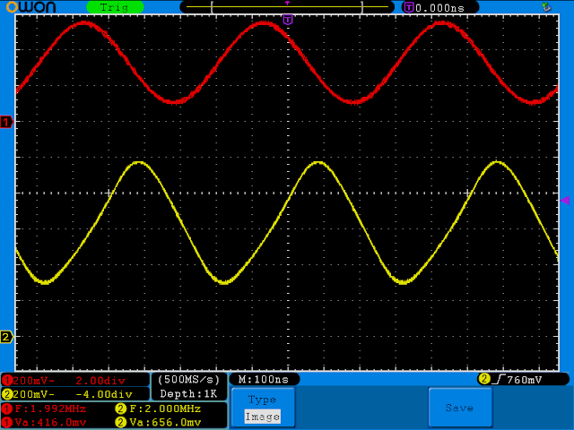 周波数を変えて周波数特性のグラフを作るのはさすがにめんどくさいので、AD9833ファンクションジェネレーターで2MHzのサイン波を出力して入出力の増幅率を見てみた。