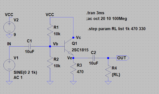 負荷が重い時に振幅が大きい信号でもクリップしないようにするには、エミッタ抵抗の値を下げてアイドル時の電流を多く流す必要がある。これはバッテリー駆動で使おうと思うとなかなか厳しい要件だと思う。